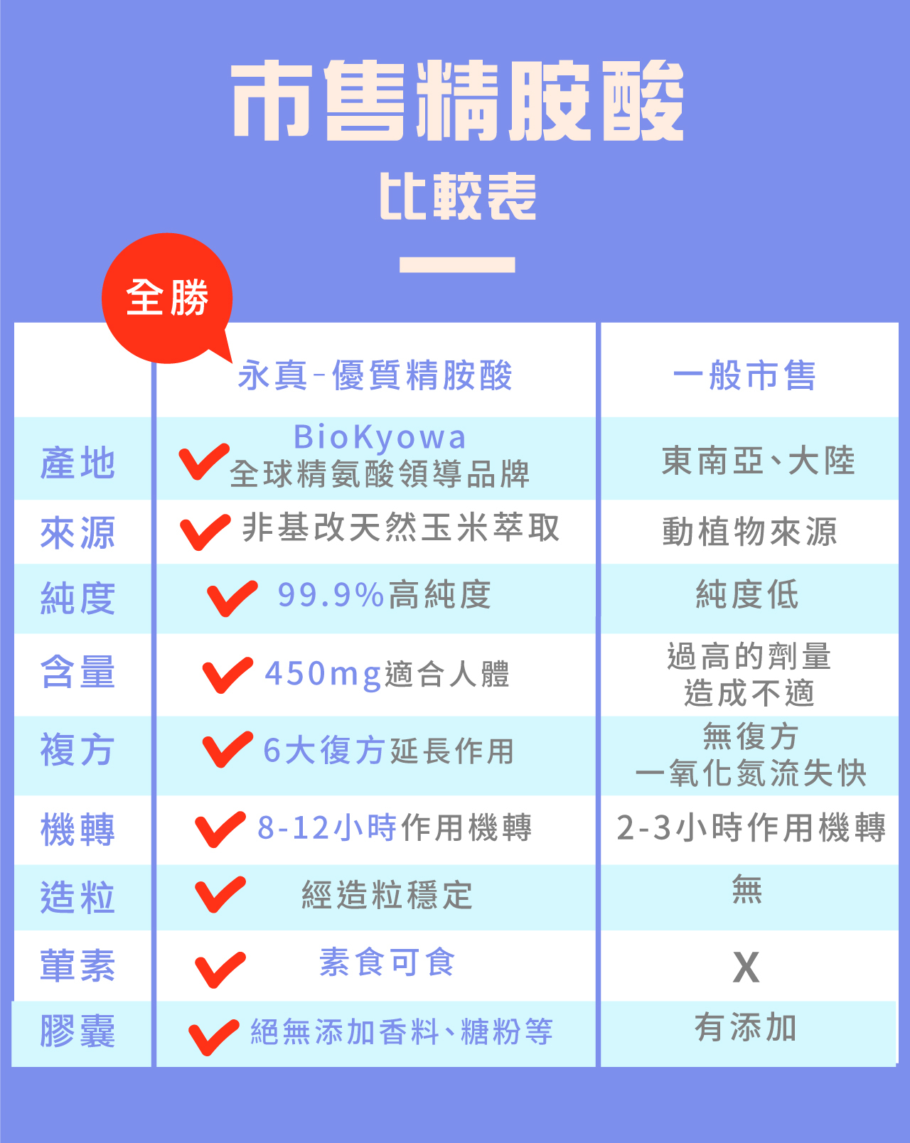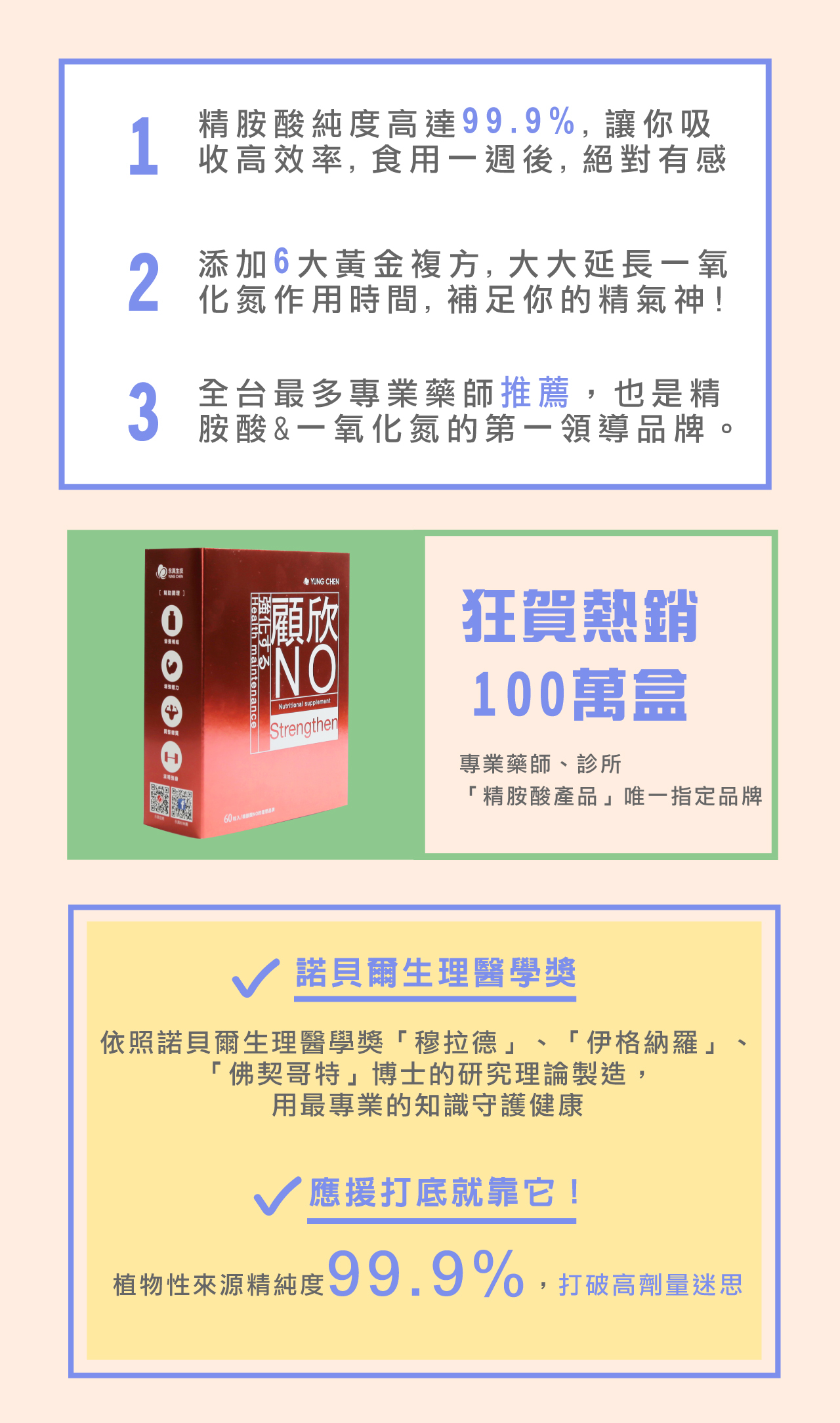 除此之外,永真生技的複方精胺酸的純度也高達99.9%,讓您可以高效率的吸收,高純度的精胺酸也無需高劑量,對身體也無負擔且更容易食用。