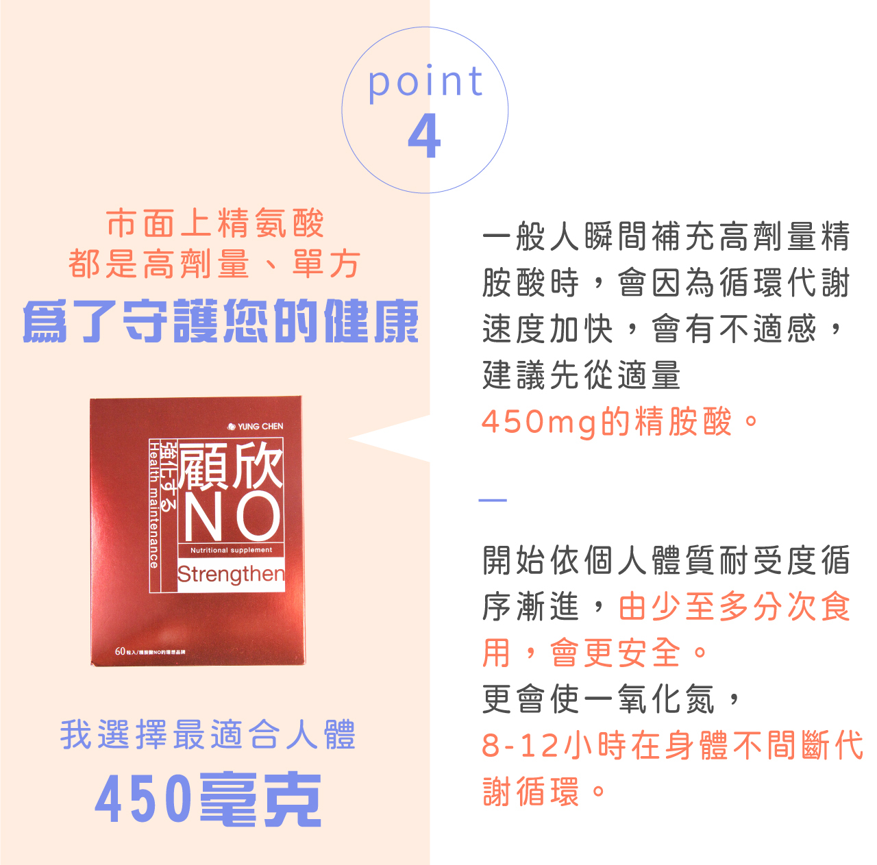 市面上,有許多他牌的精胺酸產品,幾乎為單方或高劑量而已,單方的精胺酸產生一氧化氮的作用時間,只有2-3小時!高劑量的精胺酸在短時間瞬間補充,也會因循環代謝速度加快,身體也較容易產生不適感。