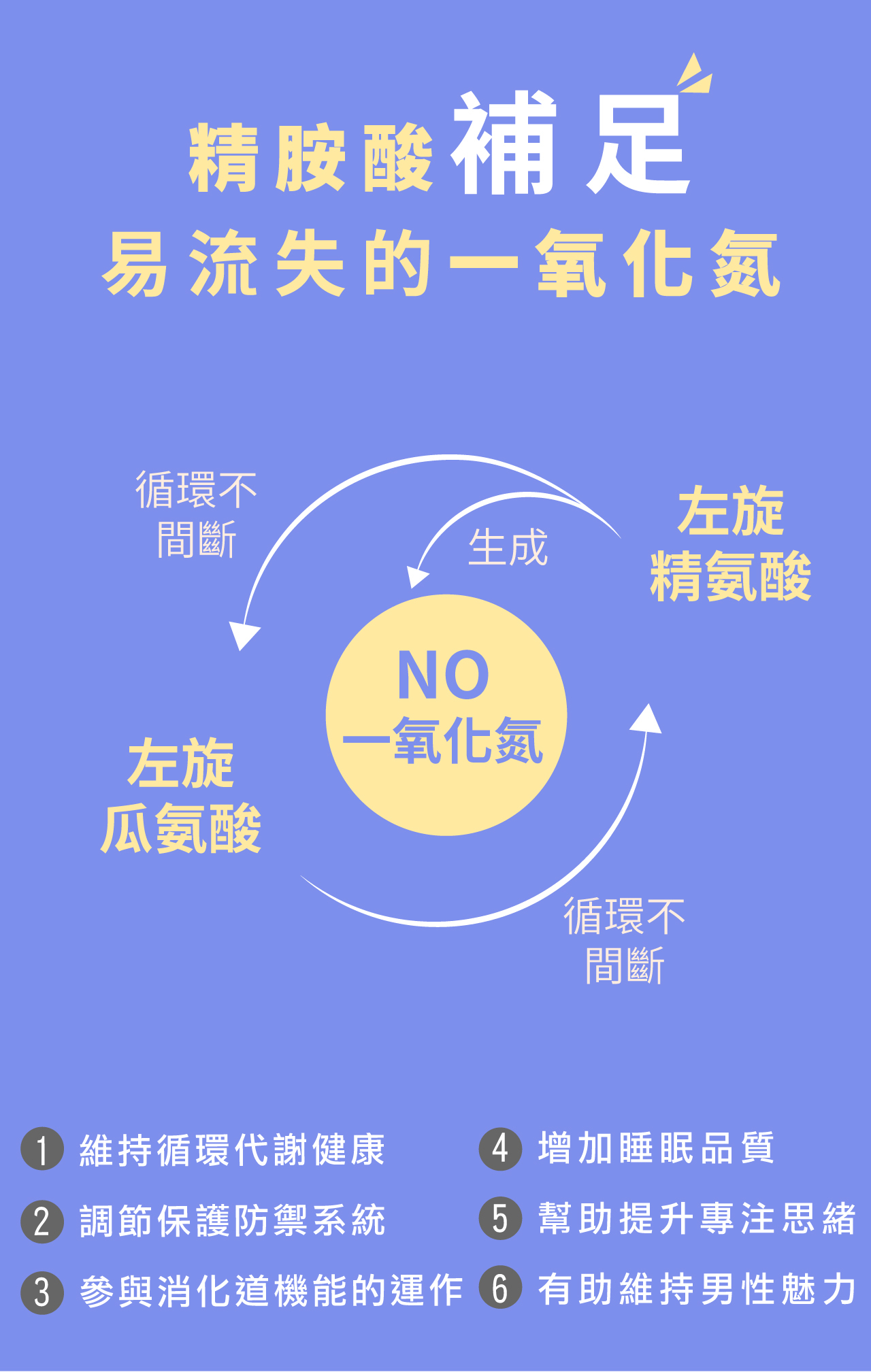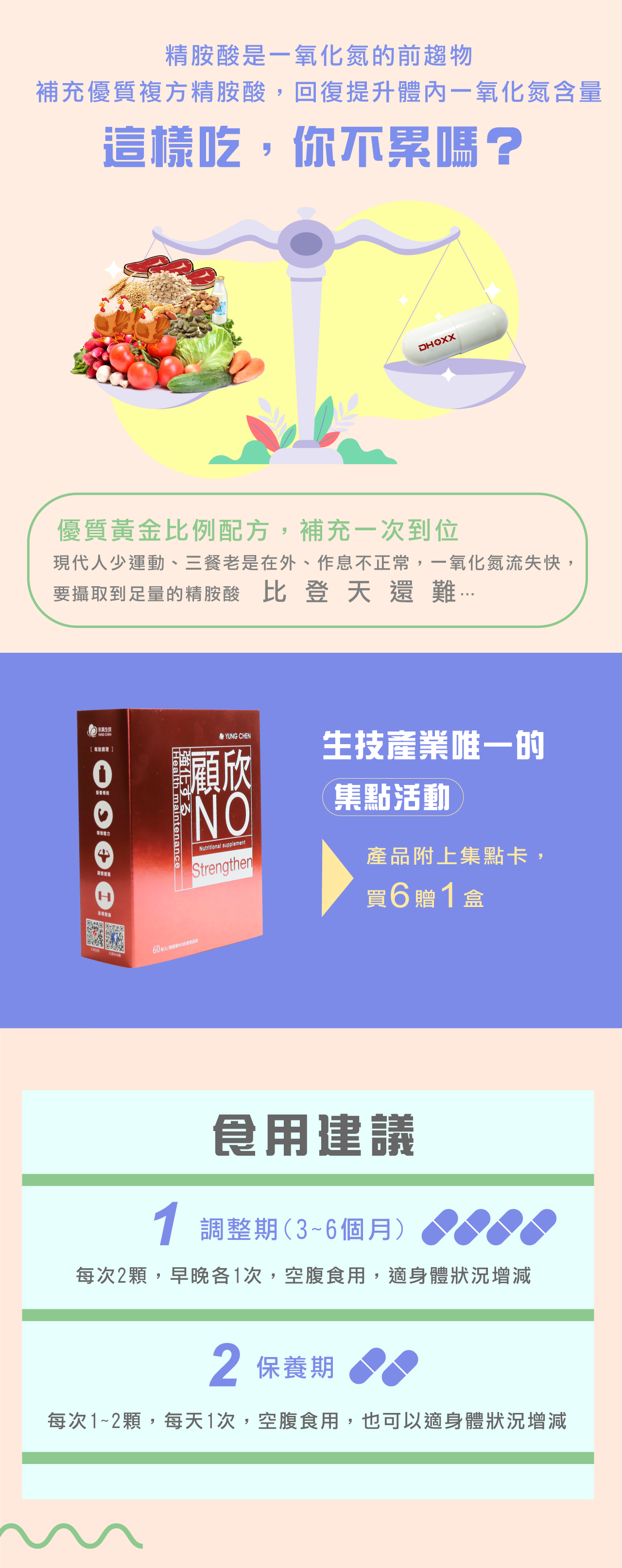 複方精胺酸最大的優點,就是可以同時擁有多種成分,且延長一氧化氮作用時間,讓您可以調節體力,體內循環代謝不打結,為您建立身體的防護罩。
