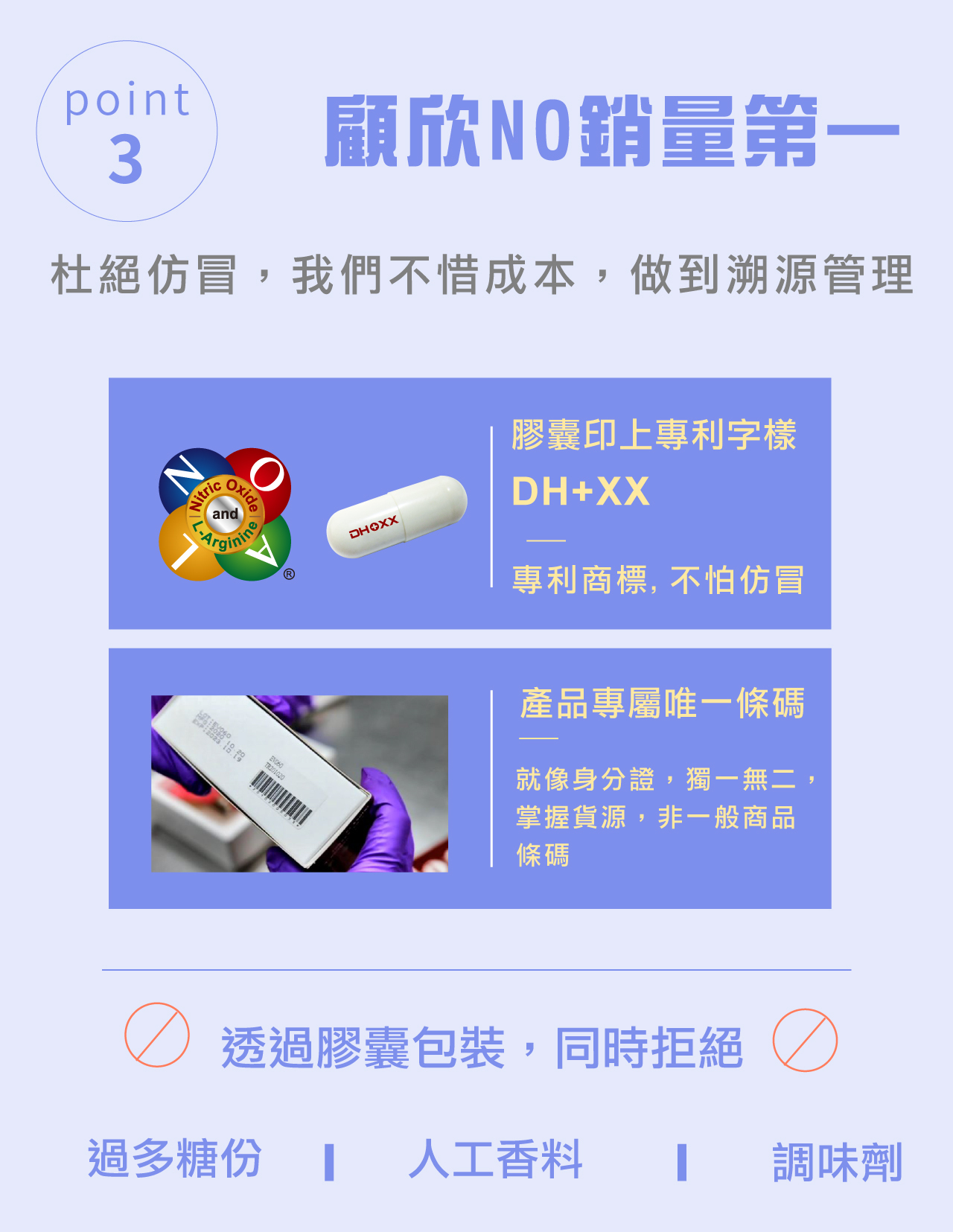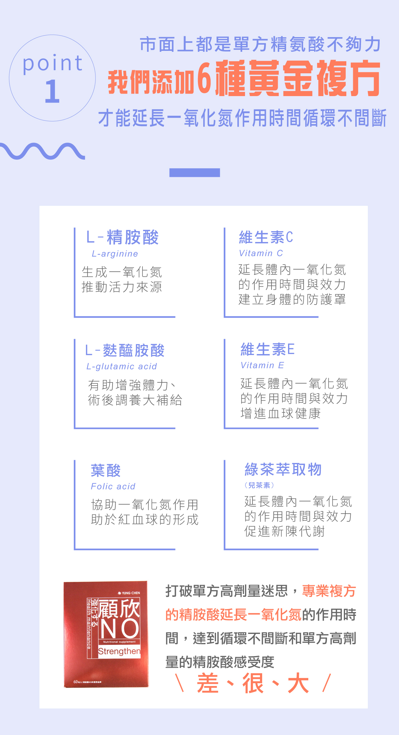 A:顧欣NO左旋精胺酸,特別添加黃金6大複方成份,L-左旋精胺酸葉酸、L-麩醯胺酸、葉酸、綠茶萃取物(兒茶素)、維生素C、維生素E等幫助一氧化氮維持在體內的作用機轉,複方才能延長一氧化氮作用時間